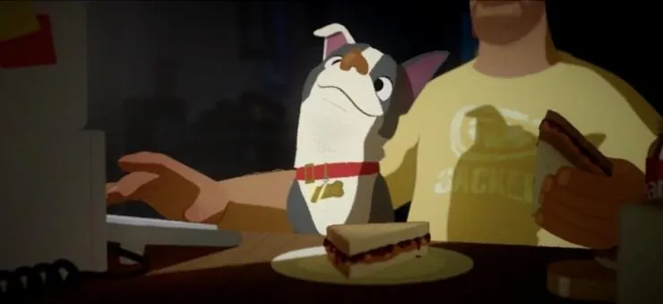 Мультфильм Меню 2014 раскрывает историю в сюжетной линии как История любви из жизни одного человека глазами его лучшего друга, собаки по имени Винстон, показанная через еду, которую они делят....